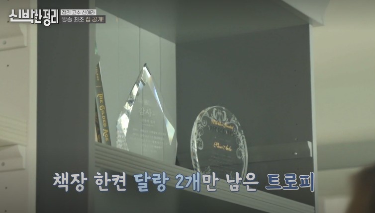 특이한 점은 책을 출판사별로 정리해놨다는 사실! 조금 독특한 방법이네요. 기독교신자인 신애라답게 종교 관련 책들을 많이 소장하고 계신것 같습니다. 그리고 수많은 트로피도 기념 사진만 찍어두고 다 버리는편이라고 합니다.