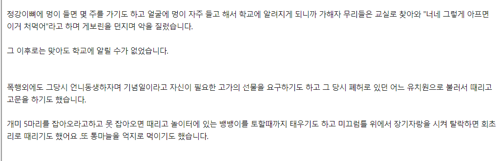 그러면서, 작성자는 “KBS 1TV ‘아침마당’에 나와서 중학생 때부터 아르바이트했다고 하는데 저희 돈을 빼앗아 간 것을 아르바이트라고 하는 것이냐”라고고 되물었는데요. 이어, 폭행 외에도 기념일이라며 고가의 선물을 요구하기도 했다고 덧붙였습니다. 여러가지 학교 폭력의 방식과 종류가 있지만, 글의 내용만 놓고 보면 진달래는 학폭의 종합 선물세트 같이 느껴질 정도입니다.