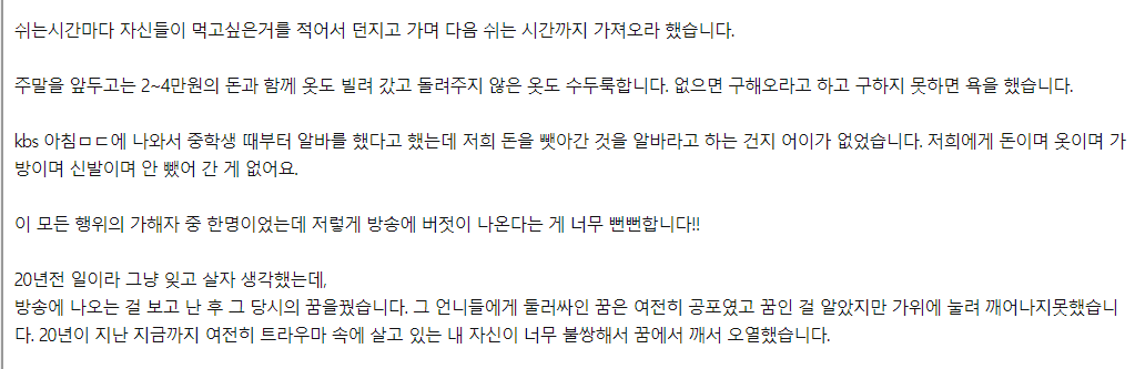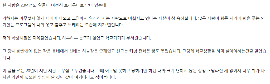 작성자는 “가해자가 아무렇지 않게 TV에 나오고, 그 안에서 열심히 사는 사람으로 비춰지는 사실이 참 속상하고, 인기 있는 프로그램에 나와 웃고 춤추고 노래하는 모습에 치가 떨린다”고 강조했습니다.