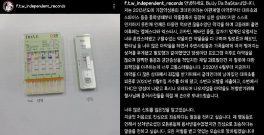 윤병호는 2020년 11월 13일 ‘f.t.w_independent_records’ 인스타그램 계정에 장문의 글과 양성 반응이 나온 마약 검사 키트 사진을 올렸습니다.