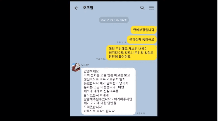 김용호는 오또맘에 대해 여러 제보를 받았다고 한다. 오또맘은 자신의 제보에 대해 사실을 말하고 싶다며 자신의 입장을 정리해서 카톡으로 보내겠다고 했다.