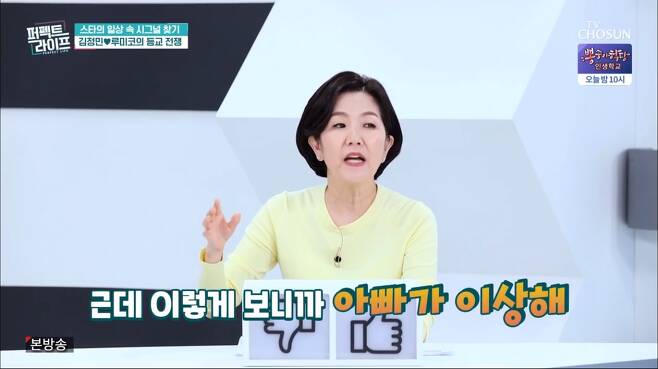 <퍼펙트라이프>의 MC현영과 홍경민은 "김정민 출연은 내 덕"이라며 서로 투닥였는데요. 이에 대해서 김정민은 "여기서 제일 친한 분은 이성미 누나다. 친밀도는 따질 수 없다"면서 이성미와의 친분으로 방송에 나왔음을 밝혔습니다.