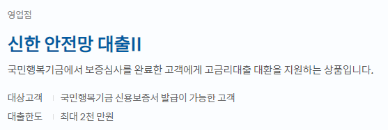 신한은행 안전망 대출은 국민행복기금의 신용보증을 통한 고금리 대출 대환 지원 상품입니다.