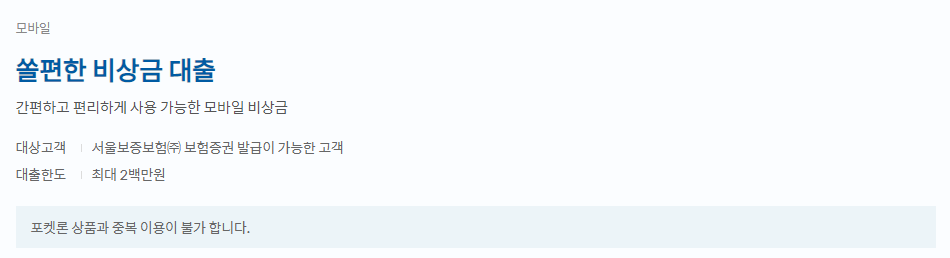 신한은행 비상금 대출은 서울보증보험의 보증보험을 통해 간편하고 편리하게 사용 가능한 소액 마이너스 통장 대출 상품입니다.