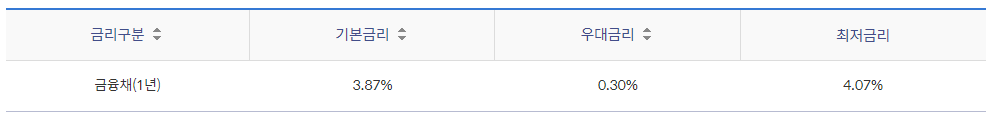 최저금리는 4.07%이며, 대출 신청인의 신용등급 및 상환여력 등에 따라 개인별 차등 책정될 수 있습니다.
