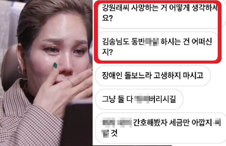 이런 강원래 김송 부부의 어려웠던, 또 충격적이었던 지난 날들이 있었기 때문에 김송에게 악성 메시지를 던진 인물이 김송에게 준 충격은 더욱 더 컸을 것입니다. 그 숱한 고통을 참아내고 이제 조금씩 회복됐는데 "동반자살해라"라는 말을 들었는지까 말이죠.