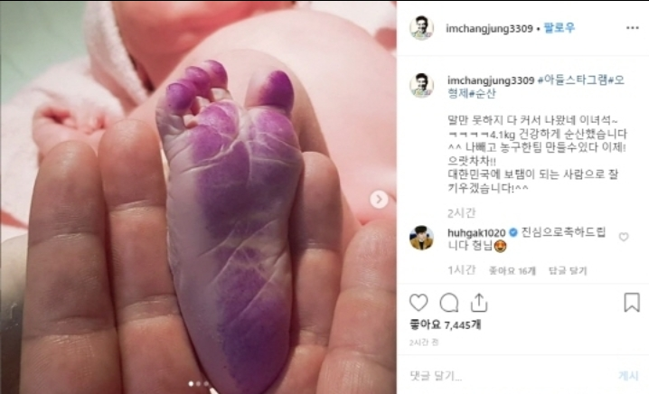 임창정은 11월 9일 자신의 인스타그램에 "말만 못하지 다 커서 나왔네 이녀석, 4.1kg 건강하게 순산했다"며 "대한민국에 보탬이 되는 사람으로 잘 키우겠습니다"라는 글과 함께 아이 발 사진 등을 올렸습니다.