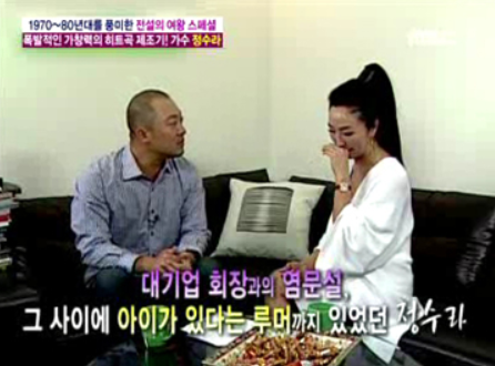 공백기 동안 재벌 총수의 자녀를 몰래 낳았다는 루머가 퍼지면서 모 기업 회장님의 아들을 낳아 5백억 원을 받았다'던 소문은 이후 '딸을 낳아 쫓겨났다', '정수라가 재벌 총수의 딸이다' 등으로 각색되어 꾸준히 유포되었다고 하는군요.