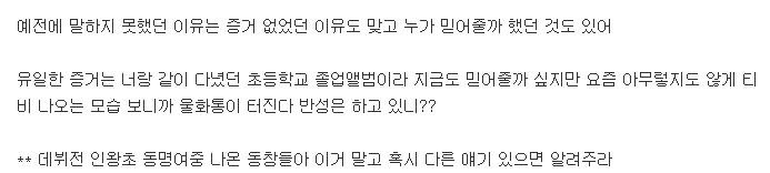 글쓴이는 "예전에 말하지 못했던 이유는 증거 없었던 이유도 맞고 누가 믿어줄까 했던 것도 있어. 유일한 증거는 너랑 같이 다녔던 초등학교 졸업앨범이라 지금도 믿어줄까 싶지만 요즘 아무렇지도 않게 티비 나오는 모습 보니까 울화통이 터진다 반성은 하고 있니?? 데뷔전 인왕초 동명여중 나온 동창들아 이거 말고 혹시 다른 얘기 있으면 알려주라"라고 덧붙였습니다.