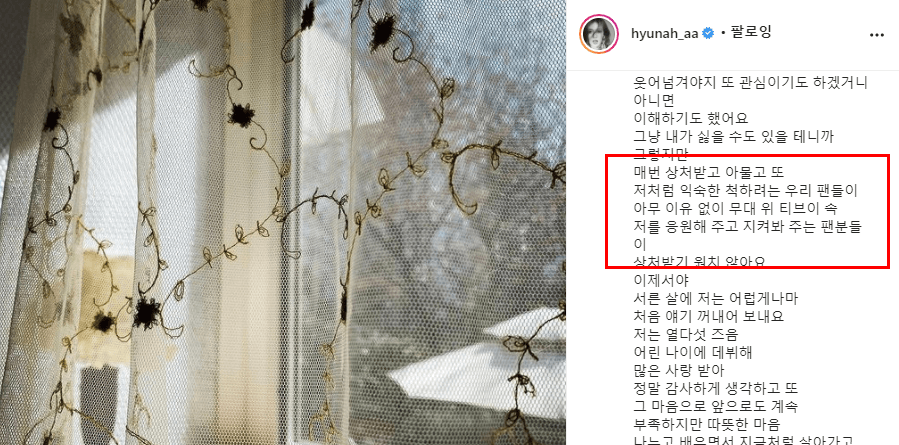 현아는 "데뷔하고 이후 과분한 많은 사랑 받으며 지내온지 10년이 넘어 이제 벌써 14년. 가끔은 지나치게 어긋나고 잘못된 관심을 표현 받을 때면 저도 부족한지라 사람이라 매번 그런 생각 했었어요"라며 "화가 나다가도 그저 제가 꿈을 위해 선택한 일이기에 웃어넘겨야지 또 관심이기도 하겠거니 아니면 이해하기도 했어요. 그냥 내가 싫을 수도 있을 테니까."라고 말했습니다.