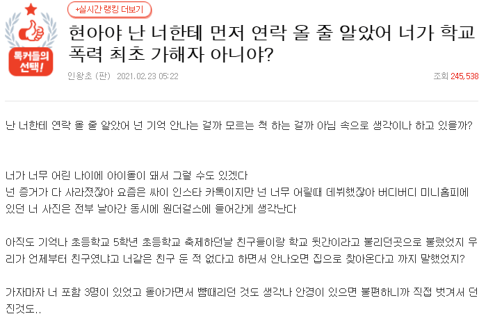 현아에 대한 학폭 폭로가 나온 것은 2021년 2월 23일인데요. 이번에도 역시 네이트판에서 폭로글이 올라왔습니다. 네이트판에는 "현아야 난 너한테 먼저 연락 올 줄 알았어. 너가 학교폭력 최초 가해자 아니야?"라는 글이 올라왔습니다.