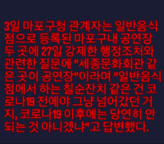 "세종문화회관 같은 곳이 공연장이다. 일반음식점에서 하는 칠순잔치 같은 건 코로나19 전에야 그냥 넘어갔던 거지, 코로나19 이후에는 당연히 안 되는 것 아니겠냐"