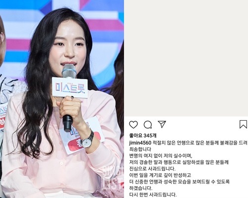 적절치 않은 언행으로 많은 분들께 불쾌감을 드려 죄송합니다. 변명의 여지 없이 저의 실수이며, 저의 경솔한 말과 행동으로 실망하셨을 많은 분들께 진심으로 사과드립니다. 이번 일을 계기로 깊이 반성하고 더 신중한 언행과 성숙한 모습을 보여드릴 수 있도록 하겠습니다. 다시 한 번 사과드립니다.
