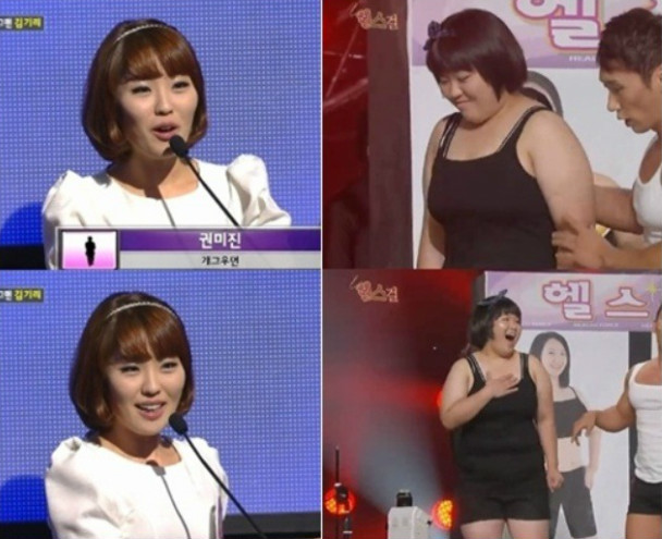헬스걸로 잘 알려진 권미진은 지난 2011년 KBS2 ‘개그콘서트’의 코너 ‘헬스걸’에서 개그우먼 이희경과 함께 다이어트에 도전, 5개월 만에 45kg을 감량해 화제를 모은 바 있다.