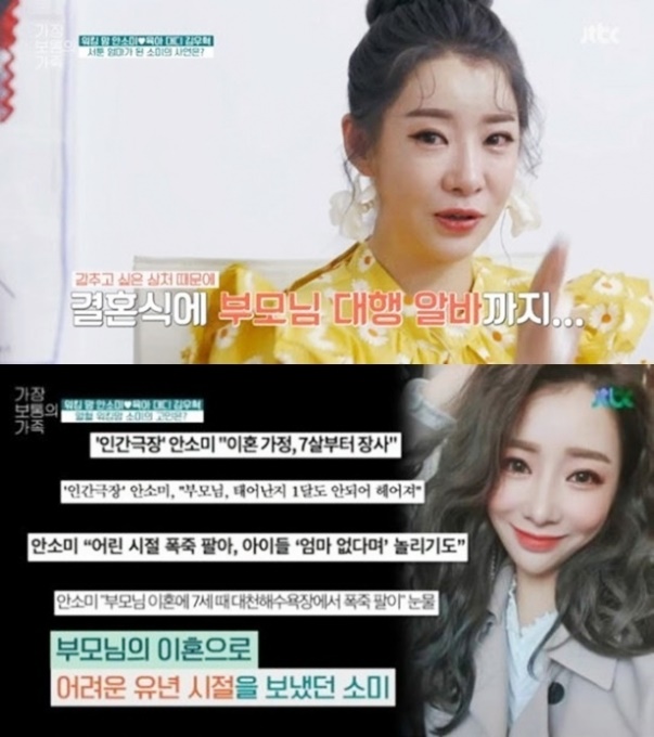 안소미는 인간극장을 통해 어린시절 힘들게 살아온 가정사를 고백했습니다. 안소미 부모님은 자신이 태어난 지 한 달 만에 헤어지면서 할머니 아버지와 함께 살았으며 7살때부터 장사를 시작했다고 고백했습니다.
