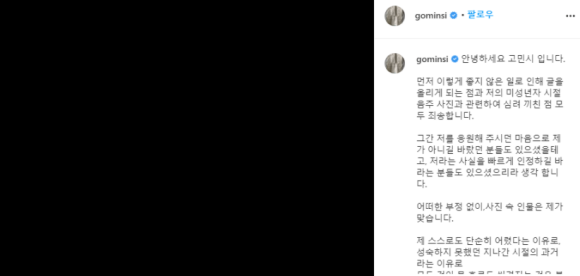 고민시는 이어 "그간 저를 응원해 주시던 마음으로 제가 아니길 바랐던 분들도 있으셨을테고, 저라는 사실을 빠르게 인정하길 바라는 분들도 있으셨으리라 생각한다"며 "어떠한 부정 없이,사진 속 인물은 제가 맞다"고 인정했습니다.