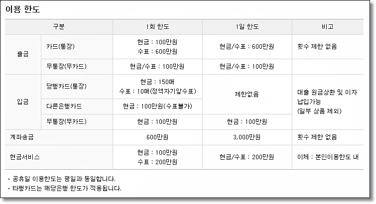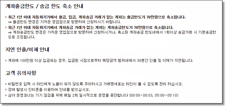 최근 1년 이내 자동화기기에서 입출금 거래가 없는 계좌는 출금한도가 70만원으로 축소되니 이점 유의하시기 바랍니다. 또, 100만원 이상 입금되는 경우 해당금액 범위 내에서 30분간 인출 및 이체가 지연됩니다.