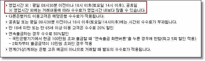 영업시간 외 기준은 평일 오전 8시 30분 이전이나 오후 6시 이후(토요일 14시 이후), 공휴일이 적용됩니다. 그리고 만 18세 미만 또는 만 65세 이상 이용 고객은 20% 할인되며 연속출금할 경우에도 50% 수수료 할인이 됩니다.