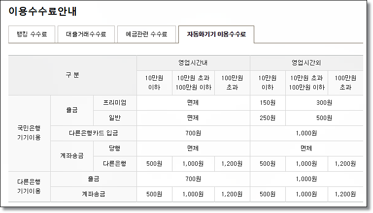국민은행 ATM 수수료 안내입니다. 국민은행 영업시간 내 출금과 당행송금은 무료입니다. 그러나 다른은행카드로 입금하거나 타은행으로 송금할 경우 500원~1200원 수수료가 붙습니다. 영업시간 외 입·출금, 계좌이체 등도 당연히 수수료를 내야합니다.