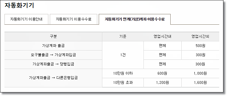 ATM 가상계좌 이용수수료입니다. 각 항목마다 수수료 면제 또는 부과되고 있으니 가상계좌를 이용하기 전에 수수료를 꼭 확인하고 이용하시기 바랍니다.