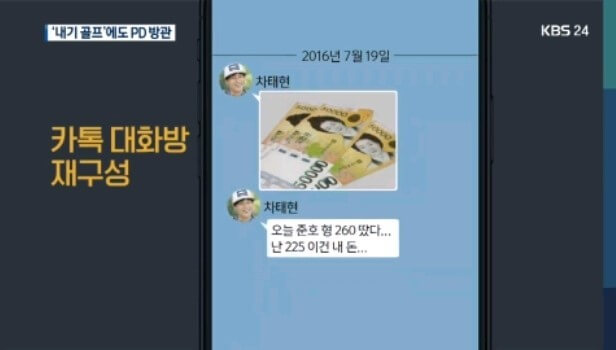 당시 카톡방의 대화 내용이 구체적으로 보도되기도 했는데요. 차태현은 2016년 7월 1일 5만원권 수십 장의 사진을 올리고, 김준호 등과 내기 골프를 쳐서 딴 돈이라고 자랑한 것으로 나타났습니다.