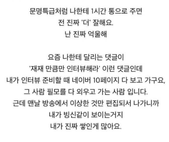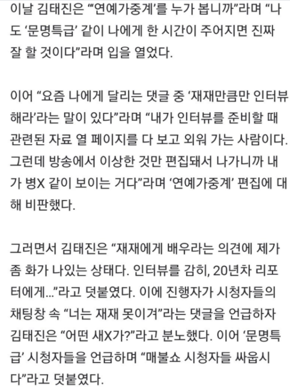 김태진은 "나도 '문명특급' 같이 나한테 1시간짜리 통으로 주면 난 진짜로 잘한다. 난 진짜 억울해. 요즘 나한테 달리는 댓글 중 재재만큼 인터뷰를 하라는 게 있는데 내가 인터뷰를 준비할 때 네이버 10페이지를 다 보고 가고 그 사람 필모그래피를 다 외우고 가는 사람이다. 근데 맨날 방송에 다 편집해나가니까 XX 같이 나가는 거지. 내가 진짜 쌓인 게 많다"고 밝혔다.