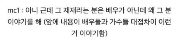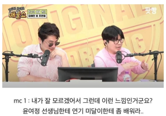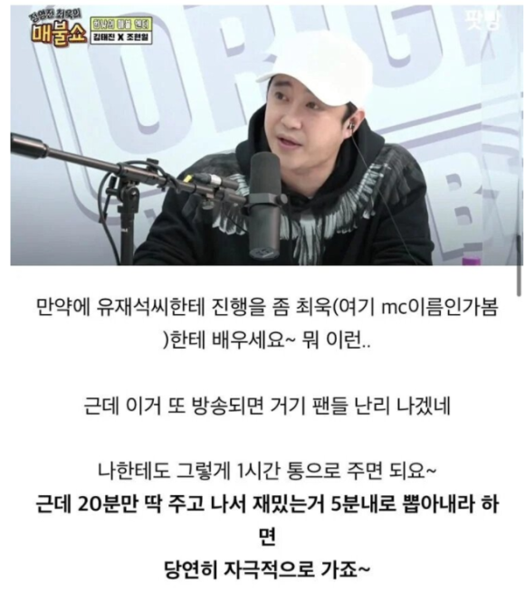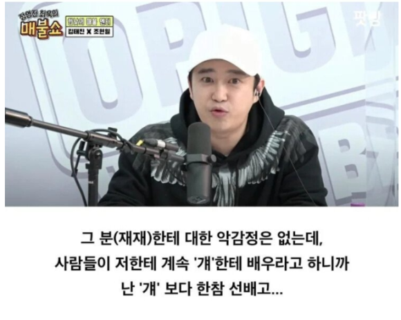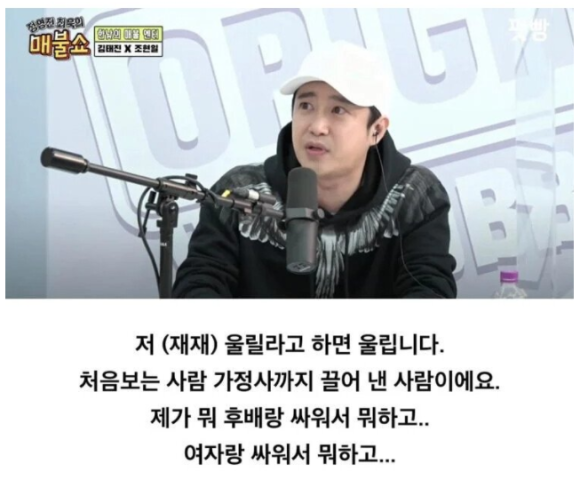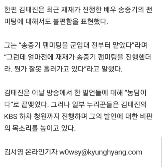 MC 최욱은 "재재라는 분은 배우가 아닌데 왜 재재 이야기를 하냐"고 물었다. 김태진은 "그분에 대한 악감정은 없는데 사람들이 자꾸 걔한테 배우라고 하니까. 난 걔보다 한참 선배고"라며 "솔직히 말하면 내가 송중기 팬미팅을 군대 가기 전부터 도맡아 했다. '착한 남자'부터. 얼마 전 재재가 송중기 팬미팅 MC를 했더라. 뭔가 잘못 흘러가고 있다"고 답했다. 이어 "웃자고 한 이야기다. 재재 존중하고 존경한다"며 웃었다.
