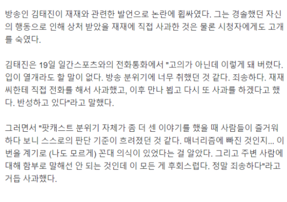 이날 방송에서 김태진은 "사실 리포터들도 예능인 범주는 아니지만 대중과 연예인의 유일한 소통창구일 때도 있다. 한심한 질문을 던질 때도 있다. 나도 그렇다. 대중이 무엇을 궁금해하는가 고찰을 한다. 편집될 뿐이지"라고 말했다. 김태진은 KBS 2TV '연예가중계'에 리포터로 출연 중이다.