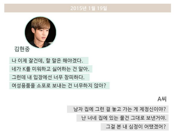 최모씨: "현중이가 그런 저를 비난하더군요. 사실 현중이 어느 정도 화를 낼거라곤 예상했어요. 제 방법이 쿨하지 못한 것도 알고요. 하지만 (그 여자의 물건을 발견했을 때) 서럽더라고요. 그냥 서러웠어요."