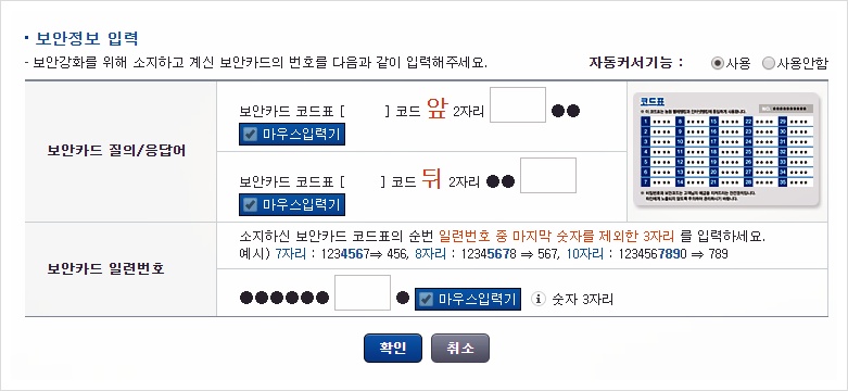 본인인증까지 끝나면 오프라인 영업점에서 발급 받은 보안카드를 이용해 OO코드 앞 2자리와 OO코드 뒤 2자리를 입력 후 오른쪽 상단에 보이는 일련번호 3자리를 입력하면 됩니다.