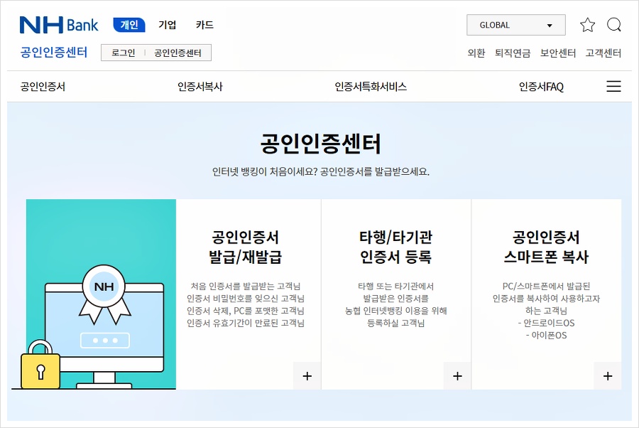 우선 농협 공인인증서를 발급/재발급 받기 위해서는 농협 은행에서 발급받은 보안카드가 필요합니다. 보안카드가 없는 경우 오프라인 영업점을 방문해 간단한 서류를 작성한 뒤 발급받은 다음 아래 설명을 따라하시면 됩니다.