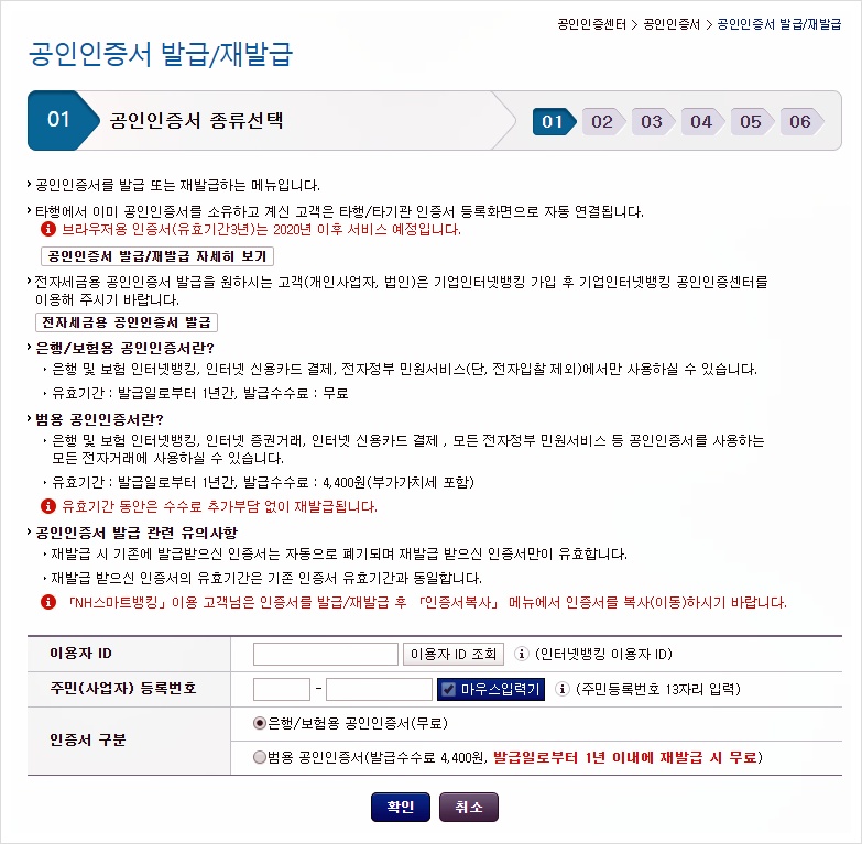 은행/보험용 공인인증서(무료)와 범용 공인인증서(4,400원)가 있습니다. 이용자 ID와 주민등록번호, 인증서 구분(은행/보험용, 범용)을 선택해 확인 버튼을 누르시면 됩니다.