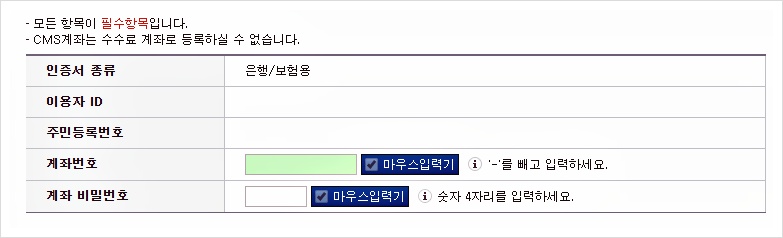 위 과정이 끝나면 계좌번호와 비밀번호를 입력하고 본인인증을 해야합니다. 집이 아닌 외부에서 공인인증서를 발급 받을 경우 마우스 입력기를 사용하는 것을 추천드립니다.