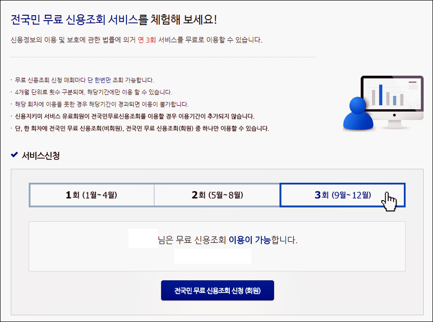 이 정보는 신용정보의 이용 및 보호에 관한 법률에 의거하여 연 3회 서비스를 무료로 이용할 수 있습니다. 대학생 뿐만 아니라 직장인들도 연 3회 무료 신용조회 신청이 가능하니 꼭 확인하셔서 자신의 신용등급 확인하시고 관리하시기 바랍니다.
