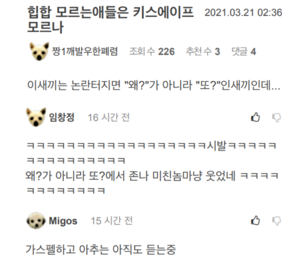 그래서 누가 키스에이프가 나온 사진에 '논산이세요?'라고 묻자 오케이션이 "지옥이다씨발아" 라고(...) 답했다.