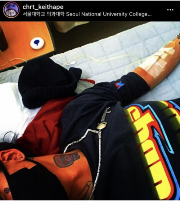 사진 속 키스에이프는 병원 침대에 누워 링거를 맞고 있다. 그는 자신의 위치를 ‘서울대학교 의과대학’이라고 알리기도 했다.