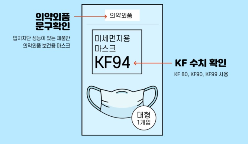또한 보건용 마스크는 제품의 포장지에 의약외품이라고 적혀있는지 확인하셔야 합니다. 계속 이야기 했던 KF80이나 KF94 또는 KF99 표시가 있는지 반드시 확인하는게 중요합니다. 위에서 언급한것처럼 KF99는 기능이 너무 높아 호흡이 어렵거나 불편할수 있어 확인을 잘 하시는게 좋습니다.