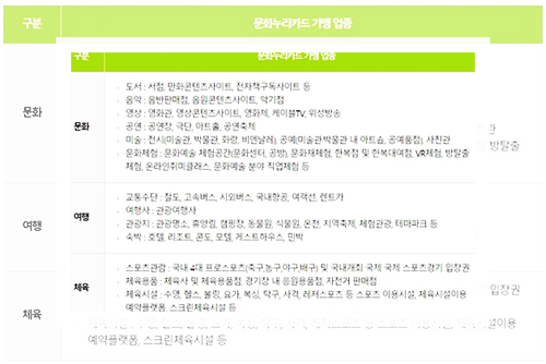 여행업종에는 교통수단, 여행사, 관광지, 숙박 관련 업종이 해당되며 체육 업종에는 스포츠 관람, 체육용품, 체육시설 및 용품에 대한 업종이 해당되어 있습니다. 해당 업종에 해당하며 문화누리카드 가맹점인 경우 지원금을 사용할 수 있습니다.