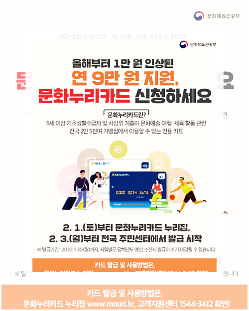 문화누리카드란 문화적 혜택을 누리기 힘들 정도로 경제적으로 어려운 사람들을 위해 정부가 정책적으로 마련한 복지 시스템입니다. 문화체육관광부와 한국문화예술위원회 및 전국 지자체의 관할 부처가 공동으로 추진하는 문화누리카드 사업은 기초생활 수급자와 차상위계층을 대상으로 시행되고 있습니다.