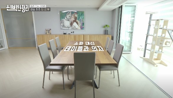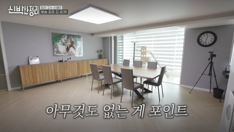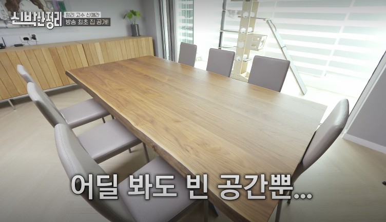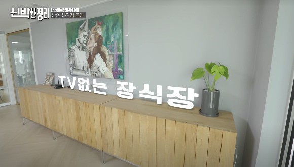 신애라는 평소에 아무것도 없는걸 좋아하는 편이라고 합니다. 박나래가 "모델 하우스 아니냐?"라고 묻기도 했습니다. 거실 장식장 위에도 최소한의 물건만 놓고, 테이블에도 아무것도 놓여져 있지 않아서 완전 미니멀 그 자체였어요.