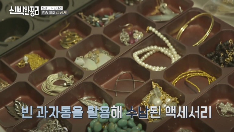 그리고 가장 특이한 점은 액세사리 정리함을 먹고 사용한 빈 과자통을 이용했다는 사실! 과자통 안에 각종 악세사리를 종류별로 깔끔하게 정리해 놨습니다.