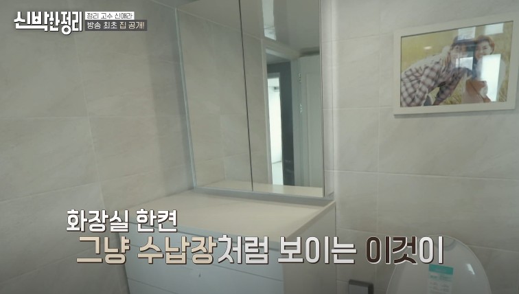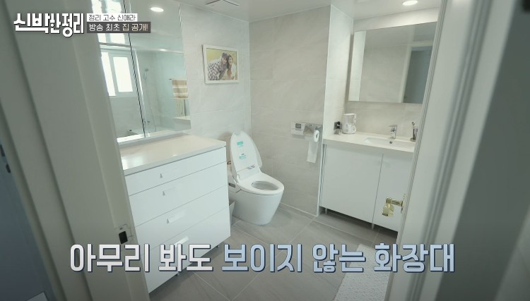 그다음은 화장대 겸 화장실 공간입니다. 깔끔한 화이트 건식 화장실. 화장실 안에 수납장으로 놓인 곳을 신애라 화장대와 남편 화장대로 대신 사용하고 있습니다.