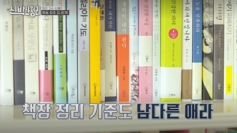 신애라는 다른 물건에 대한 소유욕은 없는편이지만 책에 대한 욕심은 많은편이라고 해요. 책이 더 많았는데 저것도 많이 정리한 편이라고. 2010년 이전에 책은 다 처분하고, 꼭 간직하고 싶은 책만 남겨두었다고 합니다.