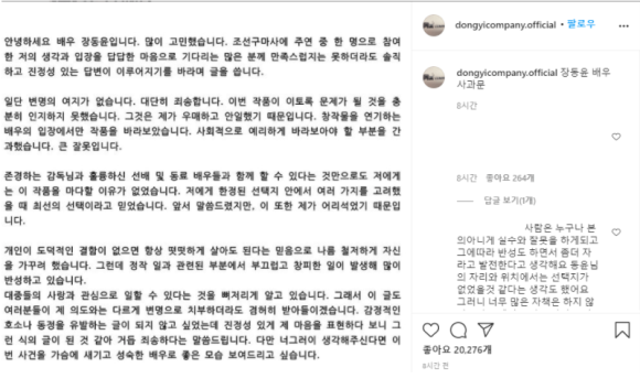 장동윤은 "이번 작품이 이토록 문제가 될 것을 충분히 인지하지 못했다. 그것은 제가 우매하고 안일했기 때문이다. 창작물을 연기하는 배우의 입장에서만 작품을 바라봤다. 큰 잘못"이라며 "존경하는 감독님과 훌륭하신 선배 및 동료 배우들과 함께할 수 있다는 것만으로도 저에게는 이 작품을 마다할 이유가 없었다. 제게 한정된 선택지 안에서 여러 가지를 고려했을 때 최선의 선택이라고 믿었지만, 이 또한 제가 어리석었기 때문"이라고 해명했습니다.