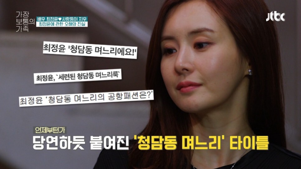 최정윤은 ‘청담동 며느리’가 따라다니는 배경에 대해 “좋은 아파트에 전세로 살고 있다”라며 “배우라 옷이 많다. 남편이 무리해서 좋은 아파트를 얻었다”고 덧붙였다. 또 주변에서 “최정윤도 집안이 좋아 엄마들끼리 결혼을 주선했을 것”이라는 말에 “전혀 아니다. 남편과 고깃집에서 우연히 만났다”고 설명했다,
