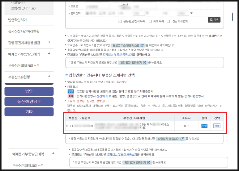 입력한 내용이 틀림없다면 아랫부분에 '부동산 고유번호'와 함께 '주소, 소유자 이름'이 검색 됩니다.
