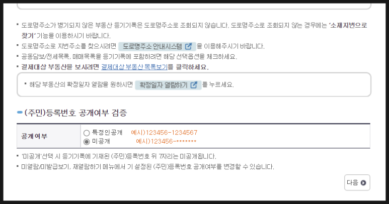 주민등록번호 공개 여부를 어디까지 할 것인지 선택한 후 '다음'을 클릭해 줍니다.