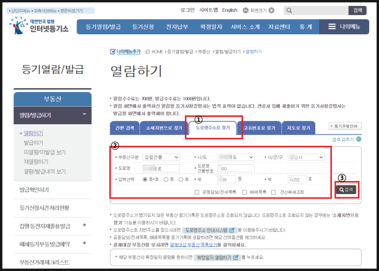 다음 찾고자 하는 부동산의 위치인 시/도, 시/군/구, 도로명 등을 입력해 줍니다.