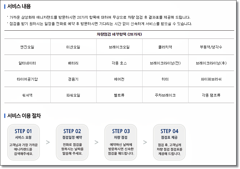 이 외에도 삼성 애니카 회원이라면 누구나 차량무상점검서비스를 받을 수 있습니다. 엔진오일부터 시작해 주차브레이크, 각종 램프류 등을 점검 받을 수 있으며 예약 후 방문하면 기다리는 시간 없이 신속하게 서비스 받을 수 있습니다.