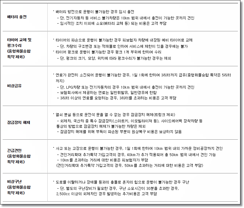 자동차 사고가 발생하거나 갑자기 시동이 안걸리는 경우 가입되어 있는 보험사 측에 연락을 걸어 문제를 해결해야 합니다.